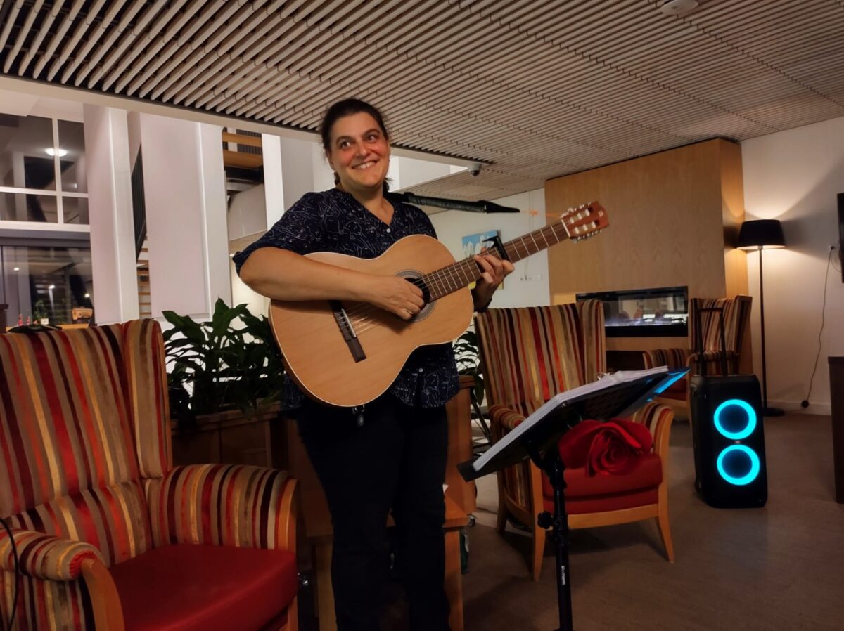 Twee vliegen in een klap; een uitspraak die we allemaal kennen, maar bij het aanschaffen van een gitaar is dit niet het eerste dat komt bovendrijven. En toch… de vraag om een nieuwe gitaar in Huize Rosa is echt bedoeld voor twee totaal verschillende doeleinden. De meest voor de hand liggende is het samen muziek maken zoals liedjes zingen. Daar bij die molen, een Marialied of zeemansliederen, alles kan passeren en altijd weer blije mensen die volop meezingen met de melodieën die ze kennen. Maar er wordt ook wel een klein concert gegeven voor bewoners die van klassieke muziek houden en daarvan genieten. Wat heerlijk dat bij een zo verschillende populatie in een huis als Huize Rosa ieder op een eigen manier wordt meegenomen in deze muziekactiviteiten. Maar tot de verrassing van Stichting Vrienden wordt de gitaar ook gebruikt om individuele bewoners die ernstig ziek zijn of stervende te begeleiden bij het ‘losmaken’ van het ziek zijn of van het leven. Een bijzondere invalshoek, waarin de klanken leiden tot minder onrust, meer ontspanning of een vermindering van de pijnbeleving. Wat een prachtige tweeledige bestemming gaat deze gitaar, die de stichting met liefde wil bekostigen met het totale bedrag van €400,00, tegemoet! Sfeer, samenzang en gezelligheid gaat met deze aanschaf hand in hand met rust en ingetogenheid!