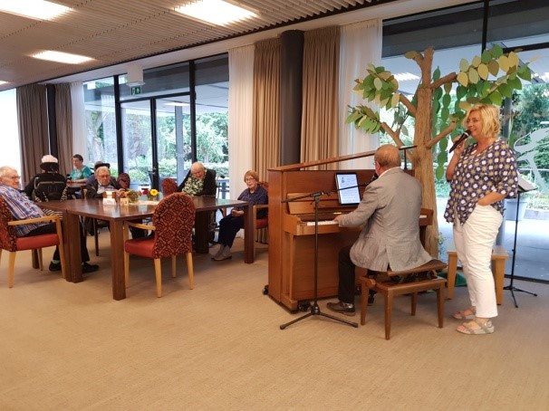 Muziek! Niet weg te denken in ons leven, zeker wanneer het minder mogelijk is om naar een concert te gaan of zelf te kunnen spelen. Een goede piano met een mooie klank vergroot dan ook het welbevinden van bewoners van Huize Rosa. Dat bewees het kleine pianoconcert wel op donderdag 23 september, de middag waarop de ‘nieuwe’piano in het Rosarium werd ingewijd. Wat maakten onze ‘pianisten’ er een gezellig en aangenaam uurtje van! Stichting Vrienden van huize Rosa hoopt met haar gift van €4000 dat deze met zorg uitgekozen piano heel veel luisterplezier zal bieden en de gezelligheid zal verhogen bij activiteiten, feesten en vieringen. En misschien zijn er muzikale bewoners die zelf hun kleine en grote talenten op dit mooie instrument kunnen laten horen?