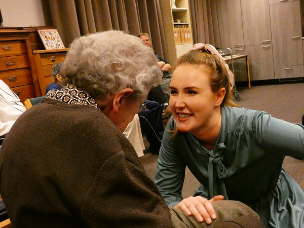 Twee theatervrouwen die bij bewoners met dementie herinneringen wakker maken, een traan tevoorschijn toveren of op een andere manier reactie uitlokken, wat is dat mooi om mee te maken!